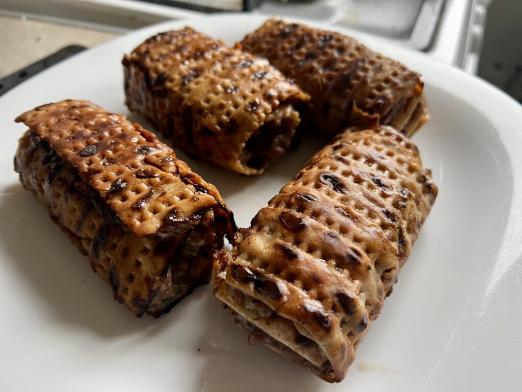 Розрізаємо лист маци навпіл. Намащуємо половинку фаршем товщиною приблизно з сантиметр. Скручуємо рулетик. І так, доки не закінчиться або маца, або фарш.
