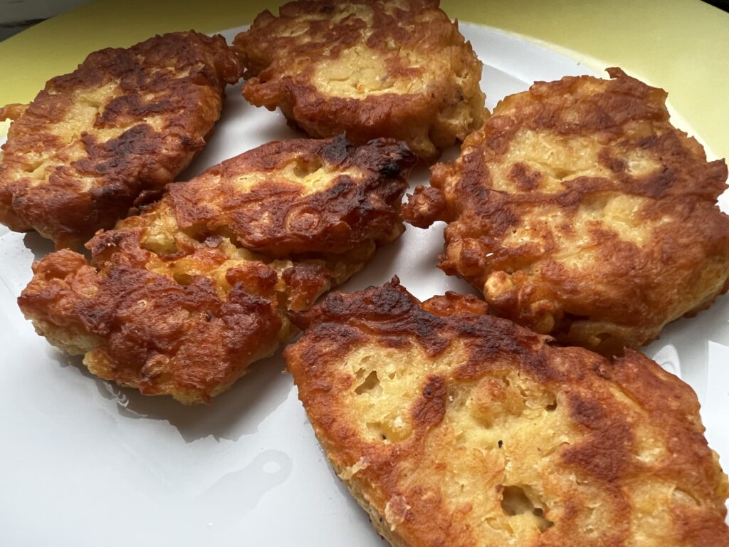 Беремо склянку гороху. Відварюємо його до стану пюре. Пюре має бути не рідке, швидше сухеньке. Але треба бути уважним, щоб не підгоріло, коли зайва волога буде випаровуватися. Одночасно смажемо гарно подрібнену цибулю. Також дрібненько ріжемо копчене мʼясо. Як горох зварився і трошки охолонув, додаємо до нього яйце, смажену цибулю, подрібнене мʼясо, чорний перець і сіль. Ретельно перемішуємо. Тісто повинно бути як густа сметана. Нагріваємо пательню і на олії обсмажуємо, викладаючи ложкою, як звичайні оладки.